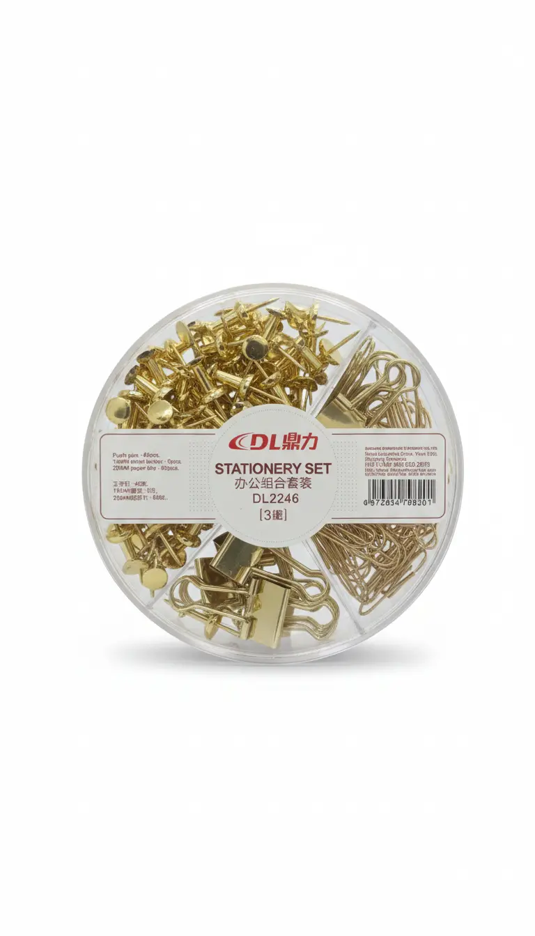 Boîte Dingli FA1160-155 avec trombones, clips et punaises dorées. Pratique, complète et élégante pour bureau, école et maison.