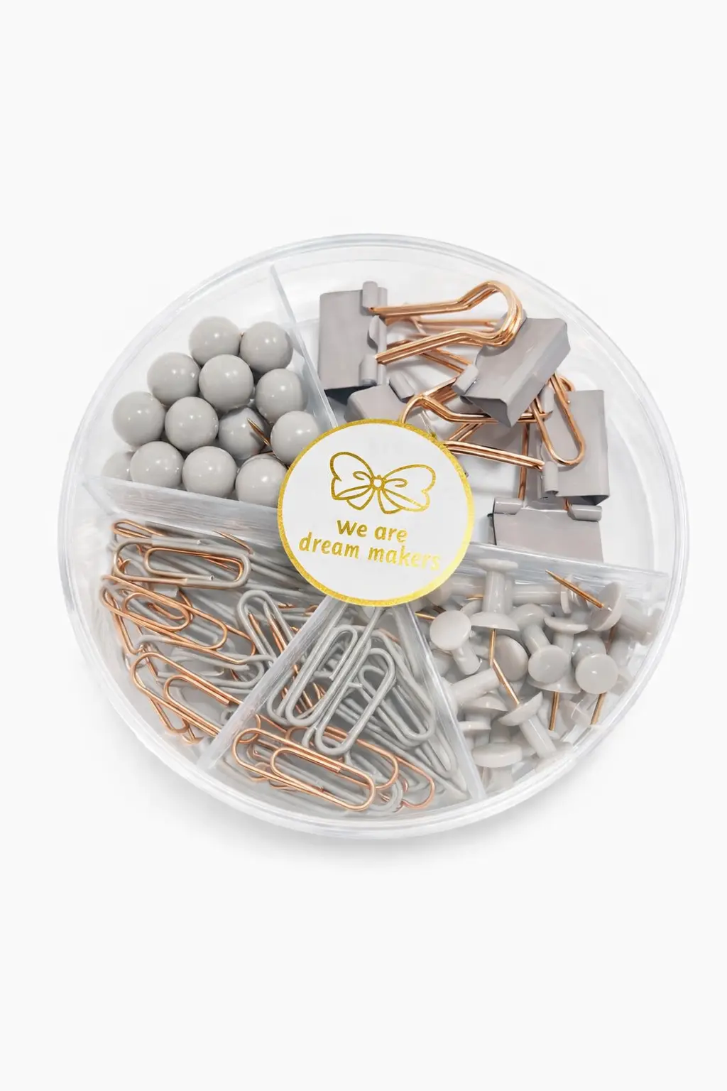 Boîte Dingli FA1160-21 avec trombones, élastiques, clips et punaises bronze. Pratique, complète et élégante pour bureau, école et maison.